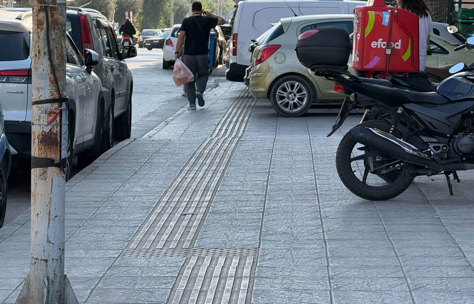 Ωστόσο, στο συγκεκριμένο σημείο αδυνατεί πολλές φορές να περάσει, καθώς τα παρκαρισμένα αυτοκίνητα και δίκυκλα αποκλείουν πλήρως τις ανάγλυφες λωρίδες που αποτελούν τον μοναδικό τρόπο ασφαλούς προσανατολισμού.