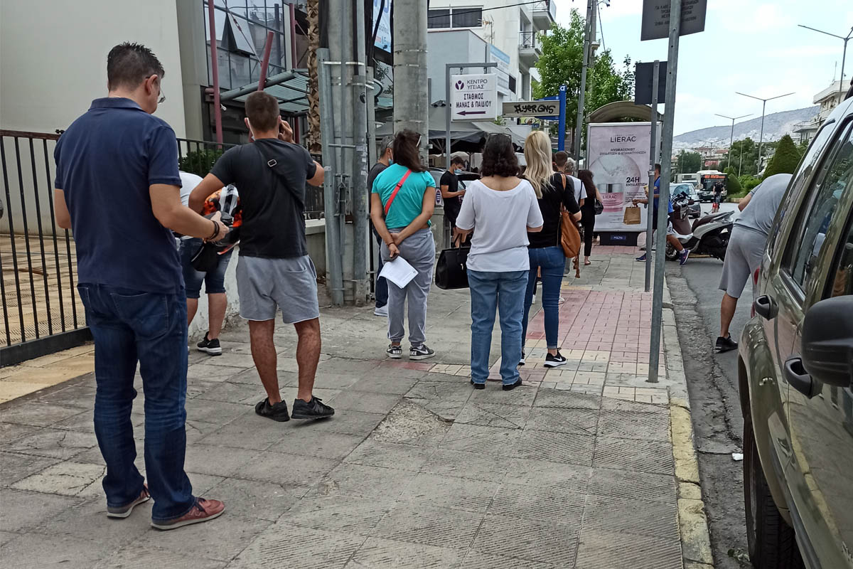 Γι’ αυτό και ακόμα και την Κυριακή έξω από ιδιωτικά διαγνωστικά κέντρα στο Περιστέρι σχηματίστηκαν ουρές για να κάνουν τα rapid test.