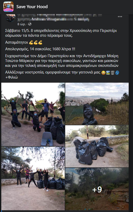 Για μια ακόμα φορά με ανάρτησή τους ευχαρίστησαν την Αντιδήμαρχο Περιβάλλοντος του Δήμου Περιστερίου, Μαίρη Τσιώτα για την παροχή σε πλαστικές σακούλες, γάντια και μάσκες όπως επίσης και για την τελική αποκομιδή των απομακρυσμένων σκουπιδιών.