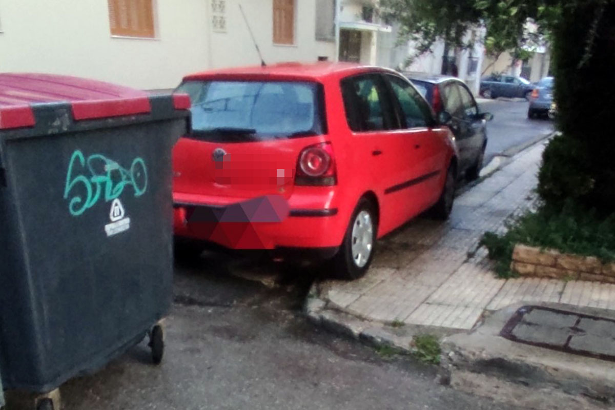 Σε δεύτερη φάση το παρκάρισμα εκτός από απερίσκεπτο είναι και παράνομο αφού για να χωρέσει στη γωνία του δρόμου καβάλησε και το πεζοδρόμιο.