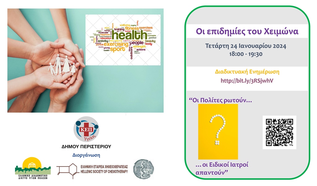 Σε διαδικτυακή ενημέρωση, μας προσκαλεί ο Αντιδήμαρχος Υγείας Δήμου Περιστερίου, Καρδιολόγος, Γιώργος Μπεκιάρης, του Ελληνικού Διαδημοτικού Δικτύου Υγιών Πόλεων του Π.Ο.Υ. με τίτλο: «Οι Επιδημίες του Χειμώνα, – Οι Πολίτες ρωτούν, οι Ειδικοί Ιατροί απαντούν», η οποία πραγματοποιείται με τη συνεργασία της Ελληνικής Εταιρείας Χημειοθεραπείας και τον Ιατρικό Σύλλογο Αθηνών.