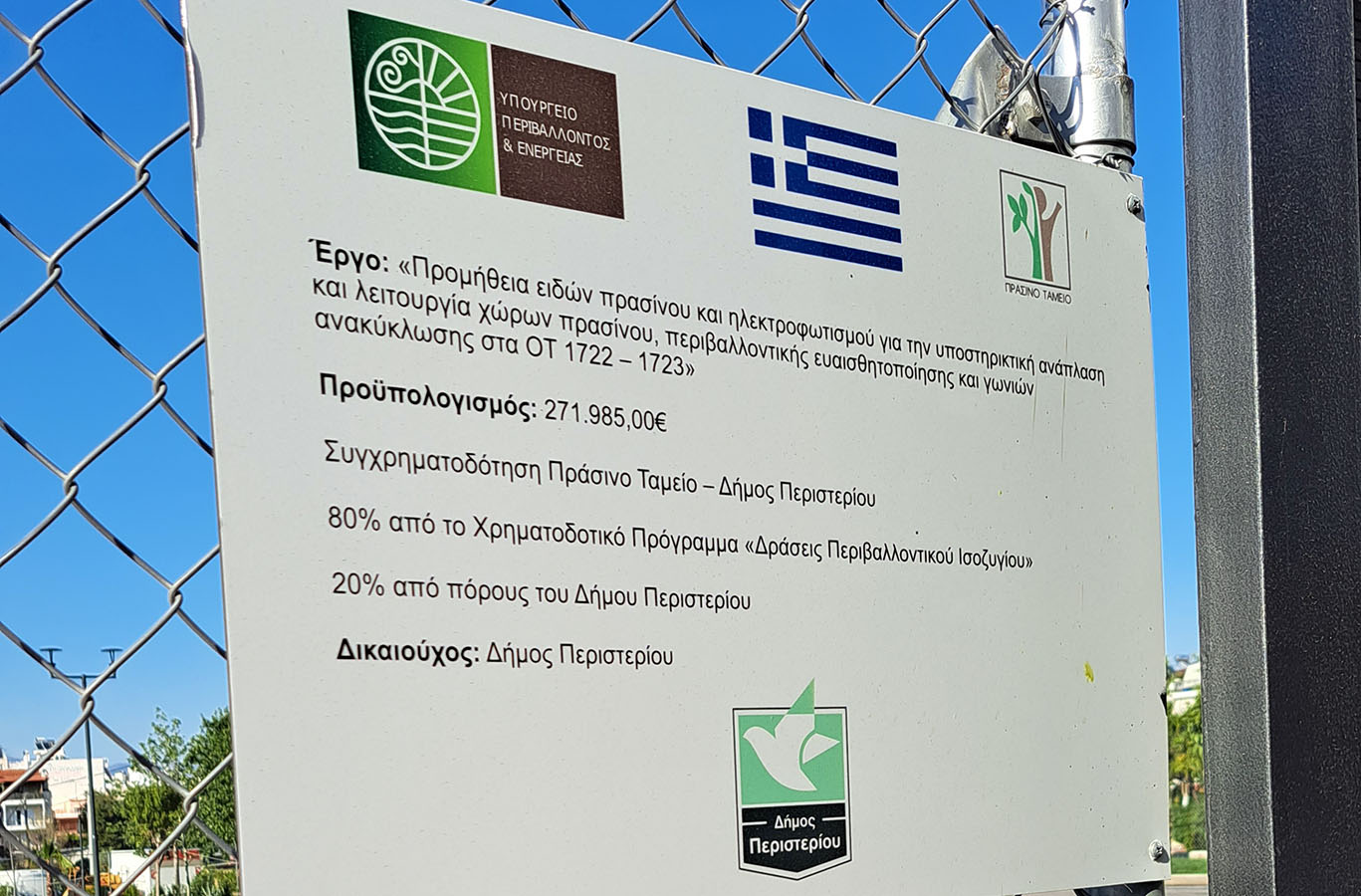 Ο προϋπολογισμός του έργου φτάνει τις 270 χιλιάδες ευρώ και η χρηματοδότησή του γίνεται κατά 80% από το Πράσινο Ταμείο και κατά 20% από ιδίους πόρους του Δήμου Περιστερίου.