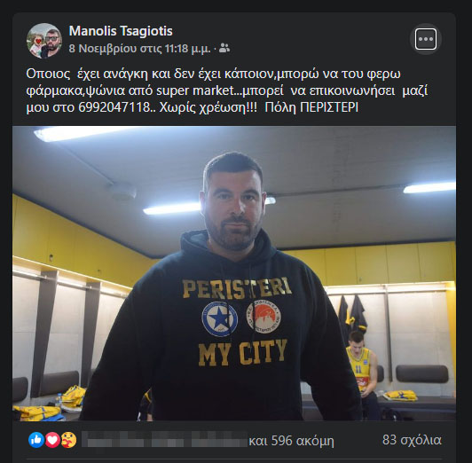 Με ανάρτησή του σε μέσο κοινωνικής δικτύωσης ενημέρωσε πως δίνει χείρα βοηθείας στους συνανθρώπους μας που έχουν ανάγκη και χρειάζονται κάποιον να τους μεταφέρει τρόφιμα ή φάρμακα στο σπίτι τους.