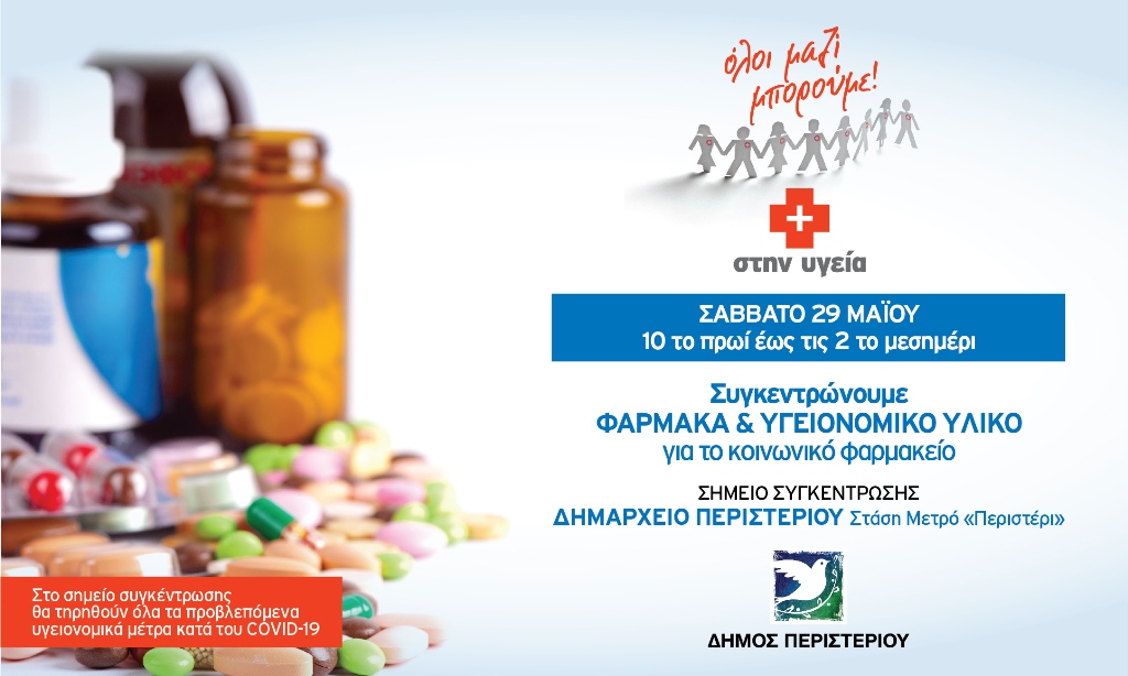 Συγκέντρωση φαρμάκων, το Σάββατο 29 Μαΐου, από τις 10 το πρωί έως τις 2 το μεσημέρι, θα πραγματοποιήσουν η κοινωνική δράση «Όλοι Μαζί Μπορούμε» σε συνεργασία με το Δήμο Περιστερίου, στο Δημαρχείο (πλατεία Δημοκρατίας) στάση Μετρό «Περιστέρι».