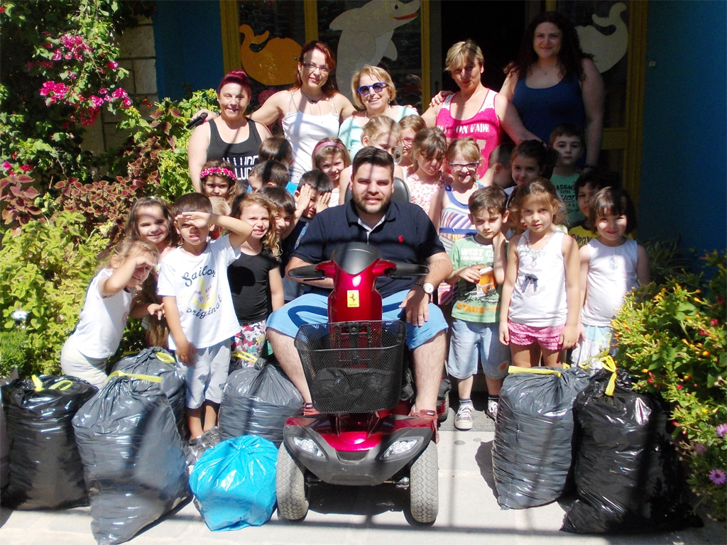 Πρόσφατα, επισκέφθηκε τον 1ο Δημοτικό Παιδικό Σταθμό, που τα μικρά παιδιά και παιδαγωγοί του παρέδωσαν μεγάλη ποσότητα από καπάκια με στόχο να προσφέρουν το χαμόγελο σε αυτούς που έχουν κινητικά προβλήματα.