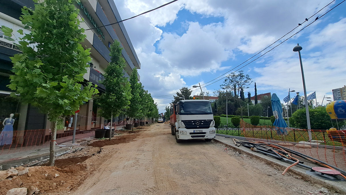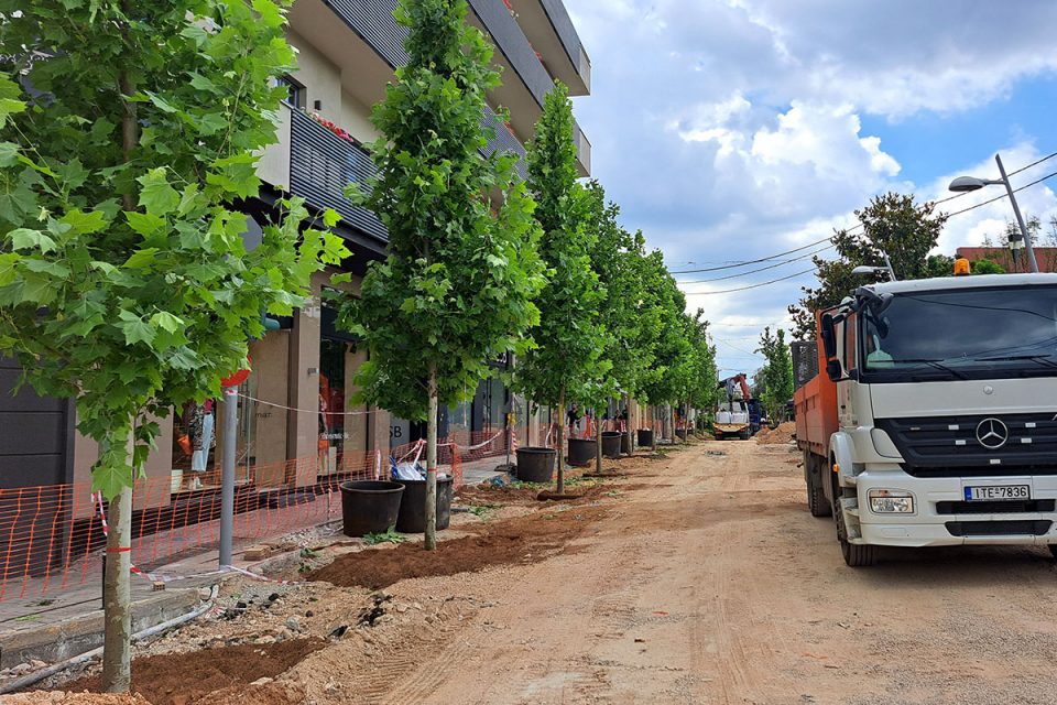 Ήδη από σήμερα τοποθετήθηκαν στο νέο κομμάτι του πεζοδρόμου δεκάδες υψηλά πλατάνια που ακόμα και σε αυτή την αρχική κατάσταση της ανάπλασης έδωσαν άμεσα μια διαφορετική εικόνα.