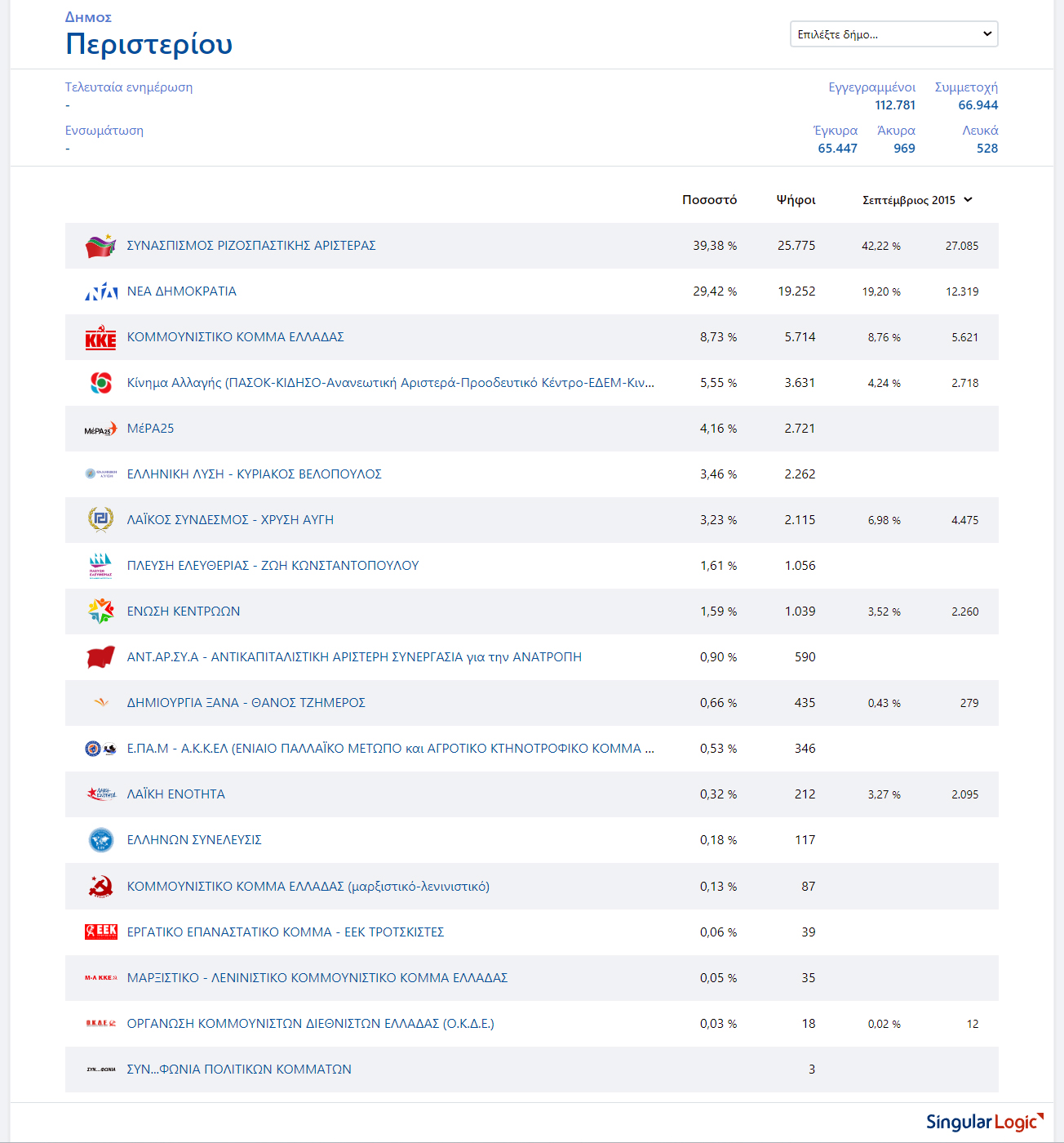 Εν αναμονή της εκλογικής μάχης της 21ης Μαΐου σας θυμίζουμε τα ποσοστά που είχαν λάβει τα κόμματα το 2019 στο Περιστέρι σε μια σίγουρα πολύ διαφορετική αναμέτρηση.