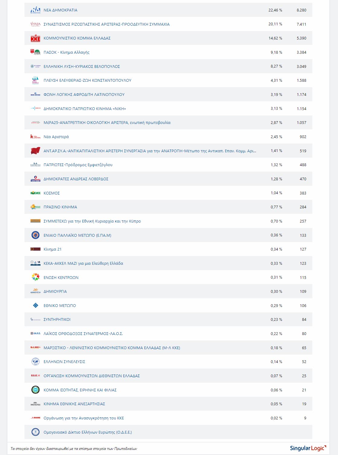 Αυτά είναι τα αποτελέσματα στα εκλογικά κέντρα στο Περιστέρι με ενσωμάτωση 82,29%: