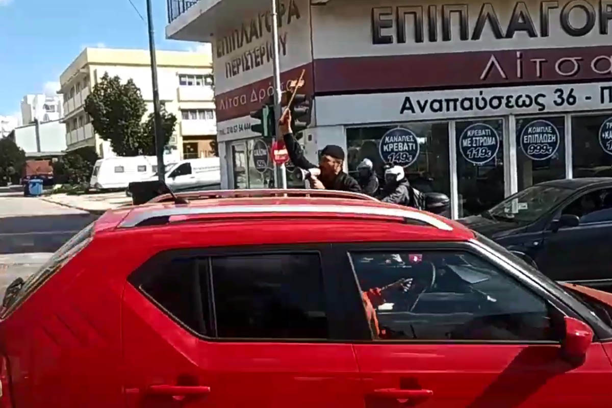 Ένας πολίτης βγήκε στη μέση του δρόμου στο Περιστέρι κρατώντας Σταυρό και ντουντούκα θέλοντας να περάσει το μήνυμά του στους διερχόμενους οδηγούς.
