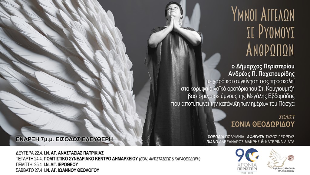 Ο Δήμαρχος Περιστερίου, Ανδρέας Παχατουρίδης, σας προσκαλεί στο κορυφαίο λαϊκό ορατόριο με τίτλο: «Ύμνοι Αγγέλων σε Ρυθμούς Ανθρώπων» του Σταύρου Κουγιουμτζή. Με την μοναδική, λυρική, εκφραστική φωνή της Σόνιας Θεοδωρίδου που προκαλεί έντονα συναισθήματα και σκορπάει ρίγη συγκίνησης.
