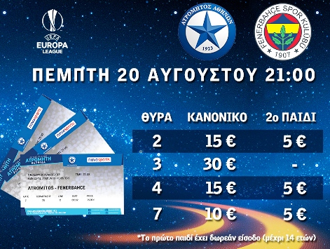 To Τμήμα Διαχείρισης Εισιτηρίων της ΠΑΕ Ατρόμητος ανακοινώνει ότι αύριο (Τρίτη) ξεκινάει από τα εκδοτήρια της Θύρας 4 η πώληση των εισιτηρίων του αγώνα με τη Φενέρμπαχτσε. Τα εκδοτήρια θα είναι ανοικτά από τις 17.00 μέχρι τις 21.00.