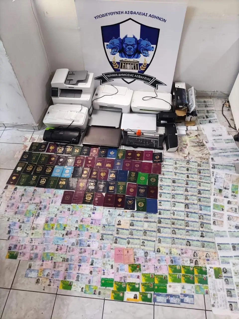 Μεταξύ άλλων κατασχέθηκαν 70 διαβατήρια, 121 δελτία ταυτότητας τρίτων χωρών, 48 άδειες διαμονής, 46 άδειες οδήγησης, 22 δελτία ασφάλισης και 5 σφραγίδες τρίτων χωρών.