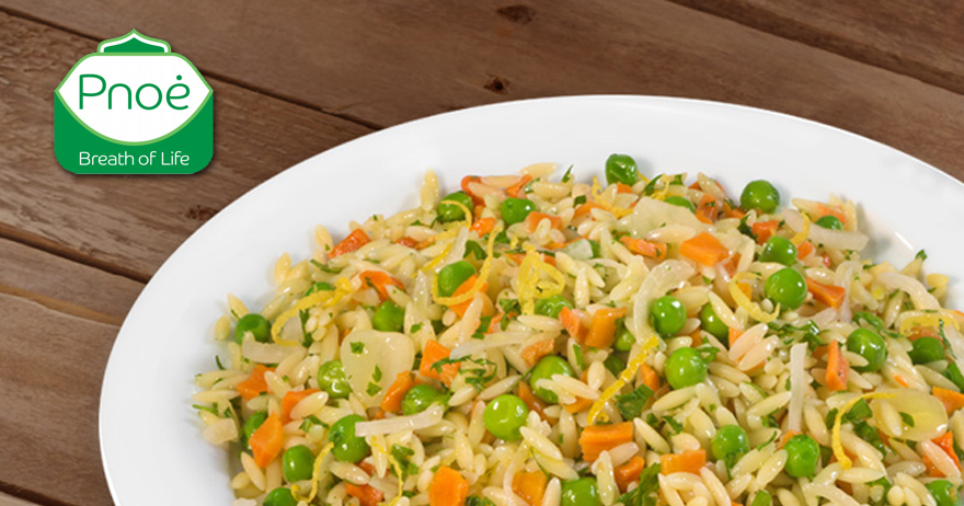 Σαλάτα Ιονίου Pnoe: Αρακάς, καρότο και κρεμμύδι αναμειγνύονται με το κριθαράκι σε μια συνταγή που εμπνέεται από τα Ιόνια Νησιά.
