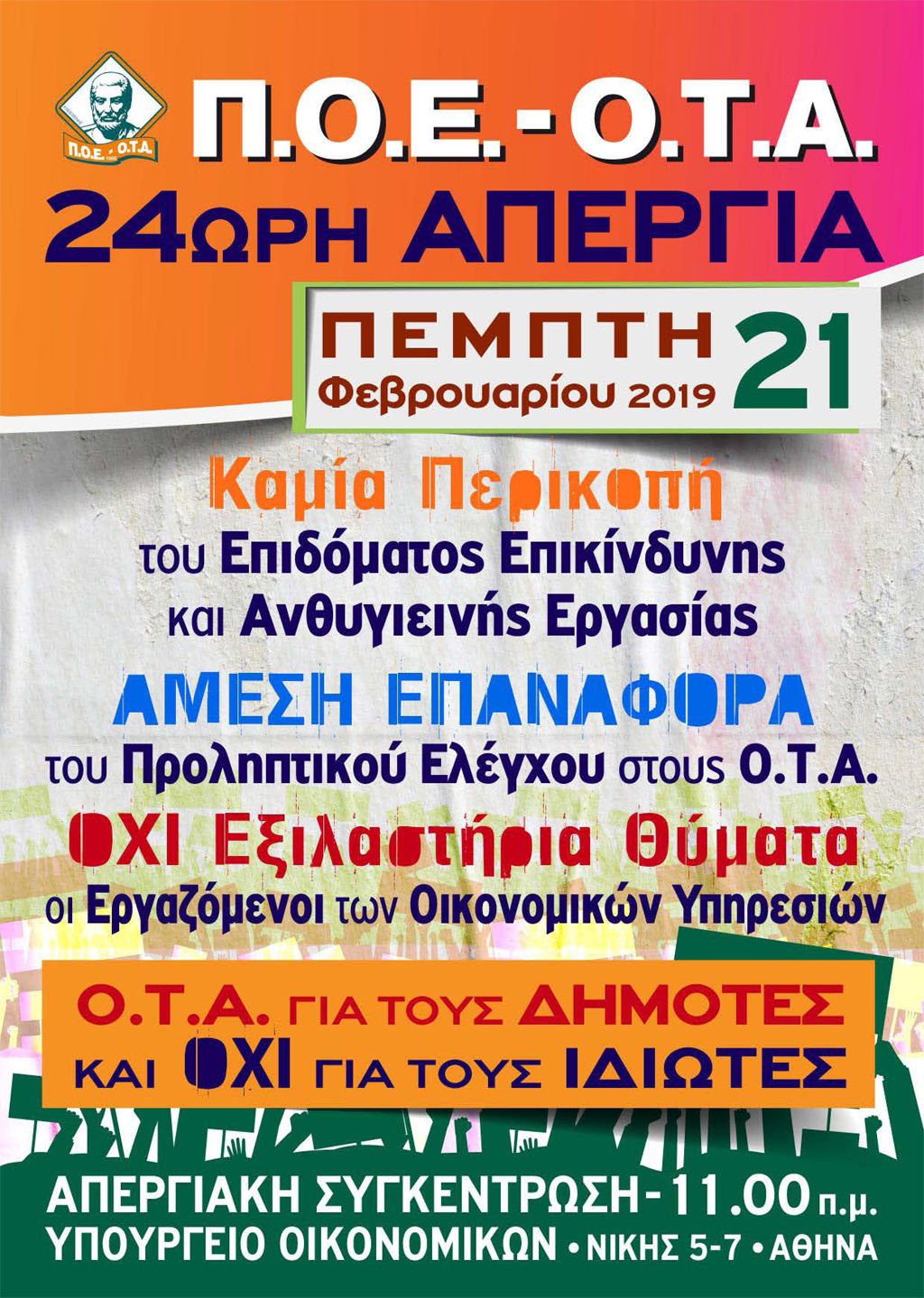 Με κύριο αίτημα την καταβολή του επιδόματος επικίνδυνης και ανθυγιεινής εργασίας, η ΠΟΕ-ΟΤΑ έχει κηρύξει για σήμερα 24ωρη απεργία για όλους τους εργαζόμενους στους Δήμους, με συγκέντρωσης διαμαρτυρίας, στις 11:00 το πρωί έξω από το υπουργείο Οικονομικών, ενώ και στη Θεσσαλονίκη οι εργαζόμενοι θα πραγματοποιήσουν συγκέντρωση στις 10.30 π.μ. στο Άγαλμα Βενιζέλου και πορεία σε κεντρικούς δρόμους της πόλης.