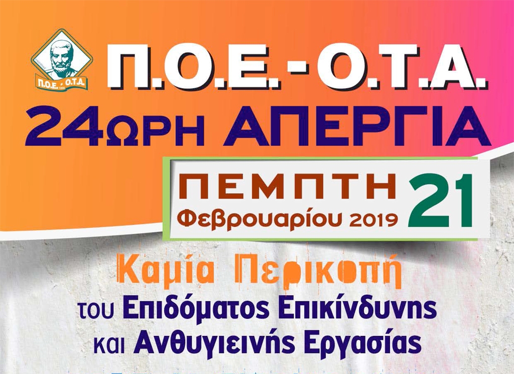 Με κύριο αίτημα την καταβολή του επιδόματος επικίνδυνης και ανθυγιεινής εργασίας, η ΠΟΕ-ΟΤΑ έχει κηρύξει για σήμερα 24ωρη απεργία για όλους τους εργαζόμενους στους Δήμους, με συγκέντρωσης διαμαρτυρίας, στις 11:00 το πρωί έξω από το υπουργείο Οικονομικών, ενώ και στη Θεσσαλονίκη οι εργαζόμενοι θα πραγματοποιήσουν συγκέντρωση στις 10.30 π.μ. στο Άγαλμα Βενιζέλου και πορεία σε κεντρικούς δρόμους της πόλης.