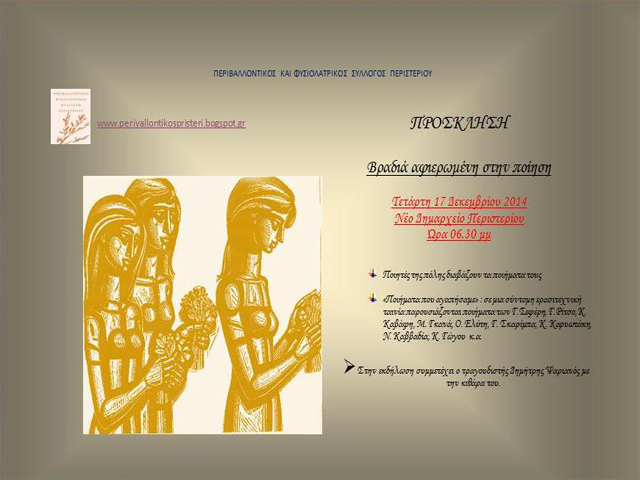 Την Τετάρτη 17 Δεκεμβρίου διοργανώνεται από τον Περιβαλλοντικό Σύλλογο ποιητική βραδιά στην αίθουσα εκδηλώσεων του Νέου Δημαρχείου στην πλατεία Δημοκρατίας, ώρα 6.30 μμ . Θα απαγγείλλουν ποιήματα τους ποιητές της πόλης και θα προβληθεί ταινία με μεγάλους έλληνες ποιητές που έχουμε αγαπήσει. Στην εκδήλωση θα συμετάσχει ο γνωστός αγαπημένος τραγουδιστής Δημήτρης Ψαριανός.