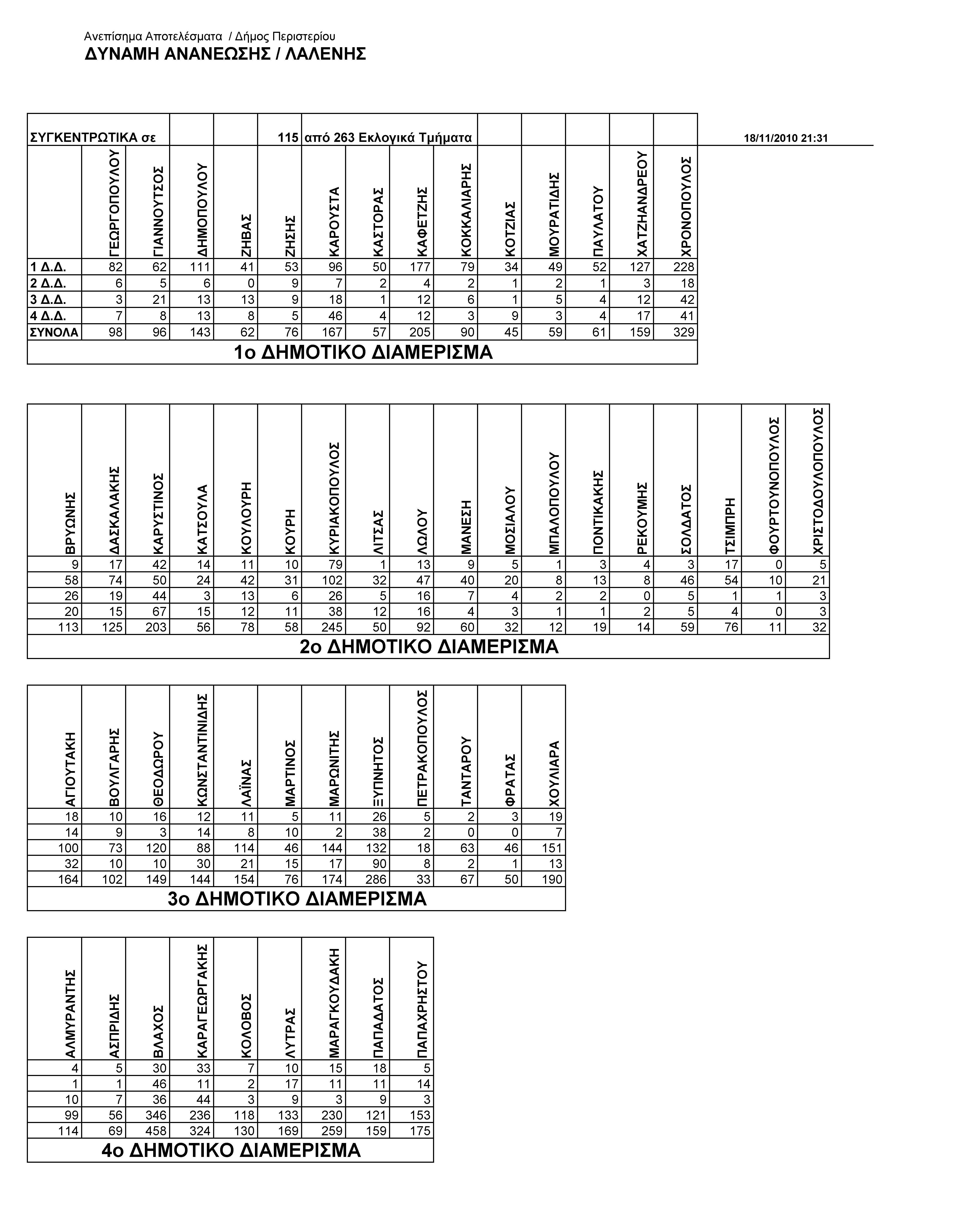 Για το συνδυασμό του Κ. Λαλένη σε καταμετρημένα 115 από τα 263 εκλογικά τμήματα, προηγούνται οι υποψήφιοι Δημοτικοί Σύμβουλοι: