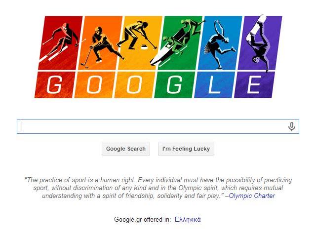 Με ένα πολύχρωμο doodle σηματοδοτεί την έναρξη των Χειμερινών Ολυμπιακών του Σότσι η Google, το οποίο συνοδεύεται από ένα κομμάτι του Ολυμπιακού Καταστατικού Χάρτη: «Ο αθλητισμός είναι ανθρώπινο δικαίωμα. Κάθε άτομο πρέπει να έχει τη δυνατότητα να αθλείται, χωρίς να υφίσταται διακρίσεις και με βάση το Ολυμπιακό πνεύμα, που απαιτεί αμοιβαία κατανόηση στο φρόνημα της φιλίας, της αλληλεγγύης και της ευγενούς άμιλλας» .
