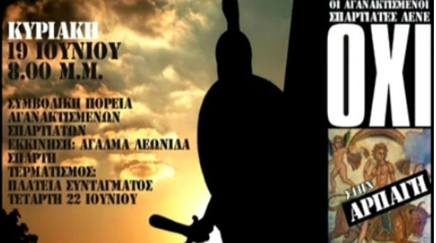 Ομάδα «αγανακτισμένων» πολιτών από τη Σπάρτη, εμπνεόμενοι από το ψηφιδωτό «Η αρπαγή της Ευρώπης», που κοσμεί την ελληνική έκδοση του νομίσματος των 2 ευρώ, ξεκίνησε το βράδυ της Κυριακής μια πορεία, με αφετηρία το άγαλμα του βασιλιά Λεωνίδα στη Σπάρτη και τερματισμό την Τετάρτη, περίπου στις 20:00, την πλατεία Συντάγματος στην Αθήνα.