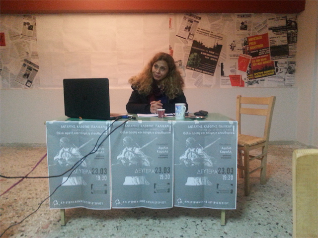 Με μαζική συμμετοχή πραγματοποιήθηκε την Δευτέρα 23/3 στο πολιτικό – πολιτιστικό στέκι της Αριστερής Κίνησης Περιστερίου η εκδήλωση με θέμα “Αντάρτης κλέφτης παλληκάρι πάντα ειν’ ο ίδιος ο λαός – θέλει αρετή και τόλμη η ελευθερία” και ομιλήτρια την φιλόλογο – συγγραφέα Αιμιλία Καραλή.