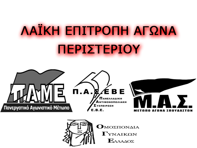 Η Λαϊκή Επιτροπή Αγώνα Περιστερίου , ανταποκρινόμενη στο κάλεσμα του Πανεργατικού Αγωνιστικού Μετώπου για ένταση και κλιμάκωση της πάλης ενάντια στη αντιλαϊκή πολιτική και τα συνεχή βάρβαρα μέτρα , ανακοινώνει το πρόγραμμα δράσης της με σταθμό το συλλαλητήριο στις 4 Οκτώβρη στην Αθήνα και κορύφωση με την πραγματοποίηση ΜΕΓΑΛΟΥ ΠΑΝΕΛΛΑΔΙΚΟΥ ΣΥΛΛΑΛΗΤΗΡΙΟΥ, την 1 Νοέμβρη, στην Αθήνα .