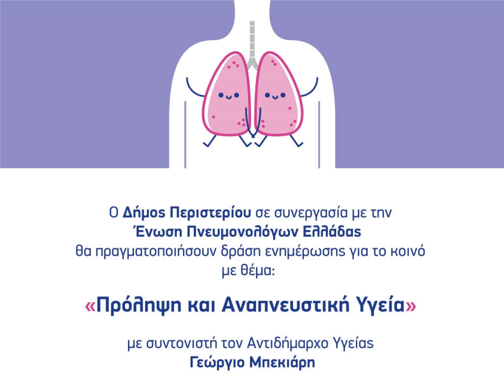 Ο Δήμος Περιστερίου σε συνεργασία με την Ένωση Πνευμονολόγων Ελλάδας θα πραγματοποιήσουν δράση ενημέρωσης για το κοινό με θέμα: «Πρόληψη και Αναπνευστική Υγεία» με συντονιστή τον Αντιδήμαρχο Υγείας Γεώργιο Μπεκιάρη.