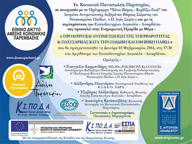 Τη Δευτέρα 3 Φεβρουαρίου 2014, και ώρα 17.30 μ.μ., το «Κοινωνικό Παντοπωλείο Περιστερίου» σε συνεργασία με το πρόγραμμα «Χάνω Βάρος-Κερδίζω Ζωή» του Ιατρείου Αντιμετώπισης Αυξημένου Βάρους Σώματος του Νοσοκομείου Παίδων «Η Αγία Σοφία» και τα Εκπαιδευτήρια Αυγουλέα-Λιναρδάτου διοργανώνουν μια εξαιρετικά ενδιαφέρουσα ενημερωτική εκδήλωση με θέμα: