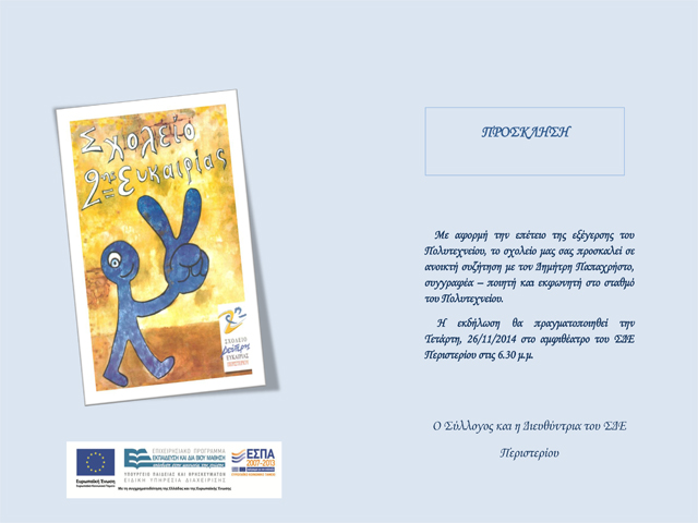 Εκδήλωση που θα πραγματοποιηθεί την Τετάρτη, 26/11/2014 στο αμφιθέατρο του ΣΔΕ Περιστερίου στις 6.30 μ.μ.