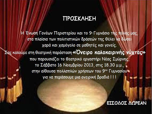 H Ένωση Γονέων και το 9ο Γυμνάσιο Περιστερίου, στα πλαίσια των πολιτιστικών δράσεων διοργανώνουν τη θεατρική παράσταση «Όνειρο καλοκαιρινής νύχτας» από το θεατρικό εργαστήρι Νέας Σμύρνης, το Σάββατο 16 Νοεμβρίου 2013, στις 18.30 μ.μ., στην αίθουσα πολλαπλών χρήσεων του Γυμνασίου.