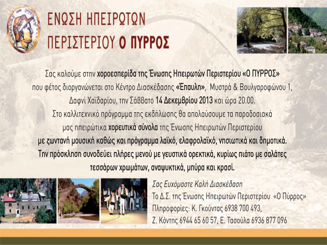 Στα πλαίσια της ετήσιας χοροεσπερίδας της Ένωσης Ηπειρωτών Περιστερίου «Ο ΠΥΡΡΟΣ» που διοργανώνεται κάθε χρόνο για 17 συνεχή έτη στο Περιστέρι,