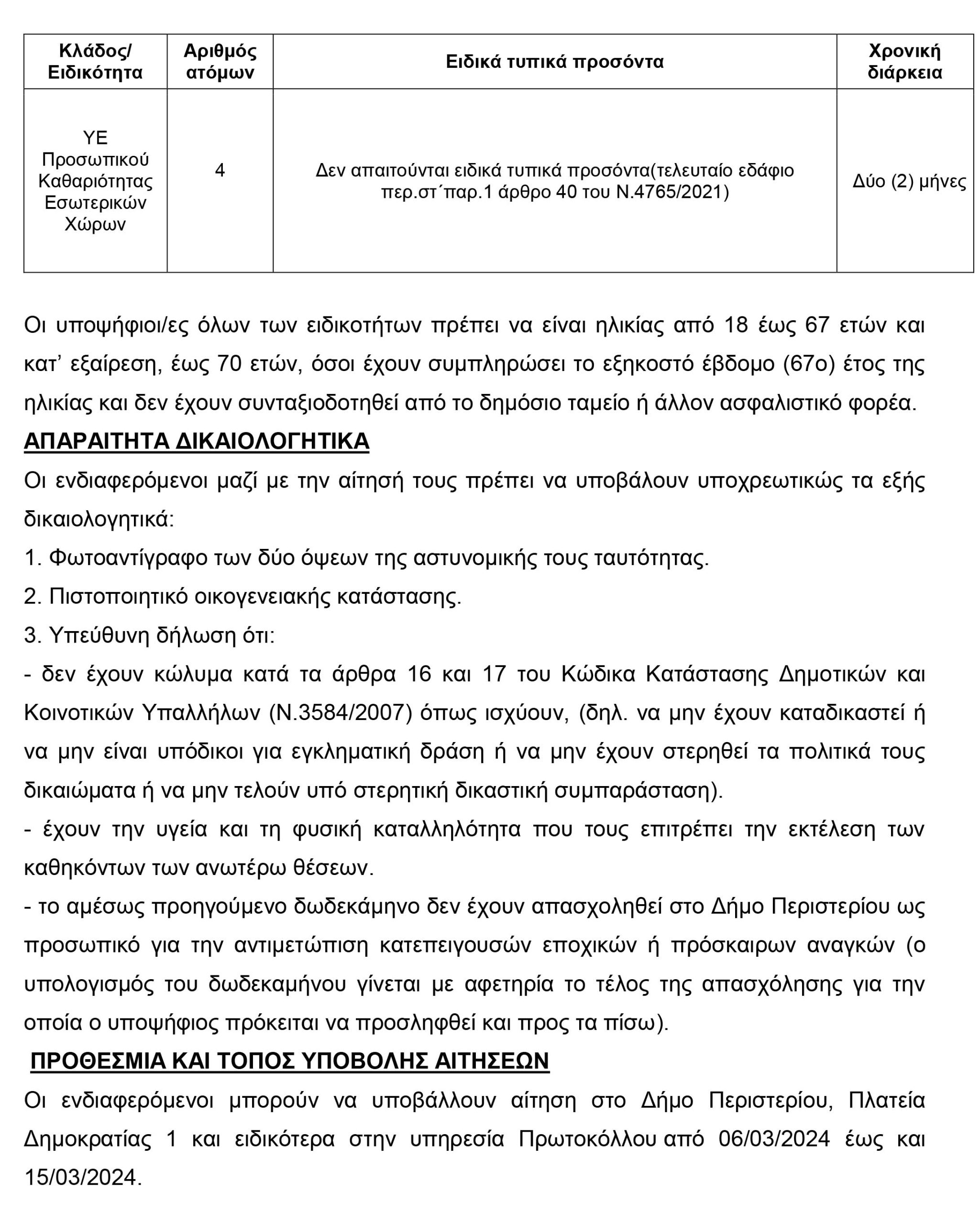 Την πρόσληψη τεσσάρων εργαζόμενων με δίμηνη σύμβαση ανακοίνωσε ο Δήμος Περιστερίου.