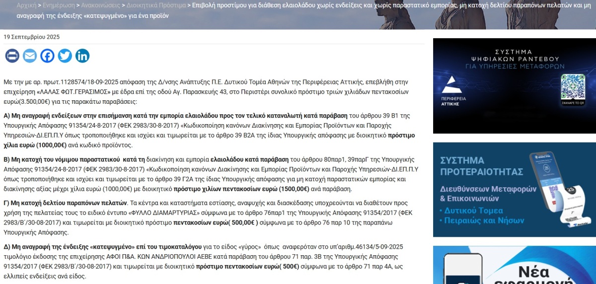 Με απόφαση της Διεύθυνσης Ανάπτυξης της Περιφερειακής Ενότητας Δυτικού Τομέα Αθηνών, επιβλήθηκε στην επιχείρηση «ΛΑΛΑΣ ΦΩΤ. Γεράσιμος», με έδρα στο Περιστέρι, συνολικό πρόστιμο ύψους 3.500 ευρώ για σειρά παραβάσεων που διαπιστώθηκαν κατά τη λειτουργία της.