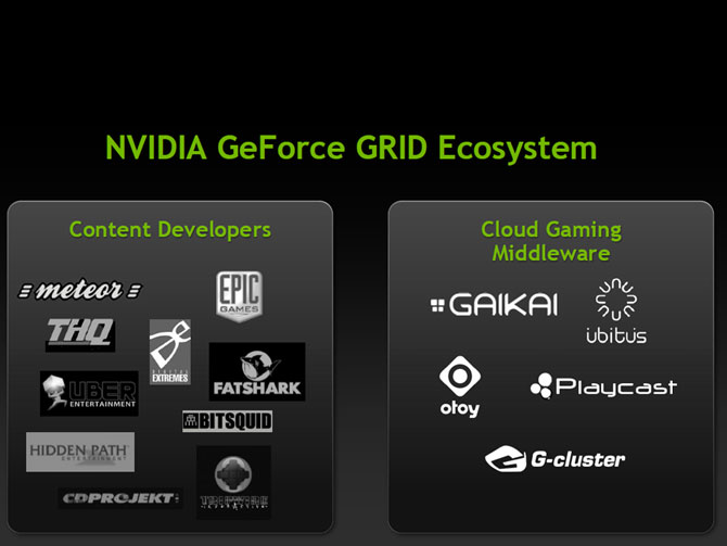 Η Nvidia βλέποντας τις προοπτικές που έχει ο τομέας αυτός θεώρησε ότι δεν θα ήταν σκόπιμο να αφήσει την ευκαιρία ανεκμετάλλευτη. Ανέπτυξε λοιπόν την τεχνολογία GeForce Grid, η οποία, σε συνεργασία με την υπηρεσία cloud gaming Gaikai, θα προσφέρει εξαιρετική ποιότητα τόσο σε ότι αφορά την ποιότητας των γραφικών κάθε παιχνιδιού, όσο και του server latency.
