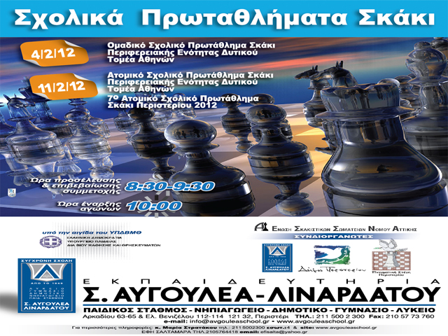 Τα Εκπαιδευτήρια Σ. Αυγουλέα-Λιναρδάτου, η Πνευματική Στέγη Περιστερίου και ο Δήμος Περιστερίου στις 4 Φεβρουαρίου 2012, διοργανώνουν από κοινού το Ομαδικό Σχολικό Πρωτάθλημα σκάκι της Περιφέρειας Δυτικού τομέα Αθηνών και στις 11 Φεβρουαρίου 2012 διοργανώνουν το Ατομικό Σχολικό Πρωτάθλημα σκάκι της Περιφέρειας Δυτικού τομέα Αθηνών και το 7Ο Σχολικό Ατομικό Πρωτάθλημα Σκάκι Περιστερίου 2012. . Παράλληλα στις 11 Φεβρουαρίου 2012, θα πραγματοποιηθεί ενημερωτική εκδήλωση με θέμα «Μαθησιακές δυσκολίες – Δυσλεξία και Σκάκι»,που θα συντονίσει η ειδική παιδαγωγός Μαρία Ευαγγελίου.