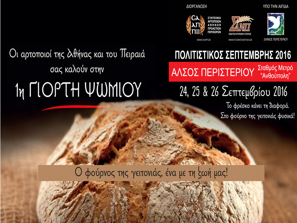 Ο Δήμος Περιστερίου, η Συντεχνία Αρτοποιών Αθηνών Προαστίων – Περιχώρων και το Σωματείο Αρτοποιών Νομού Πειραιώς διοργανώνουν την 1η Γιορτή Ψωμιού, στο Άλσος Περιστερίου (Σταθμός Μετρό “Ανθούπολη”). Είσοδος Ελεύθερη.