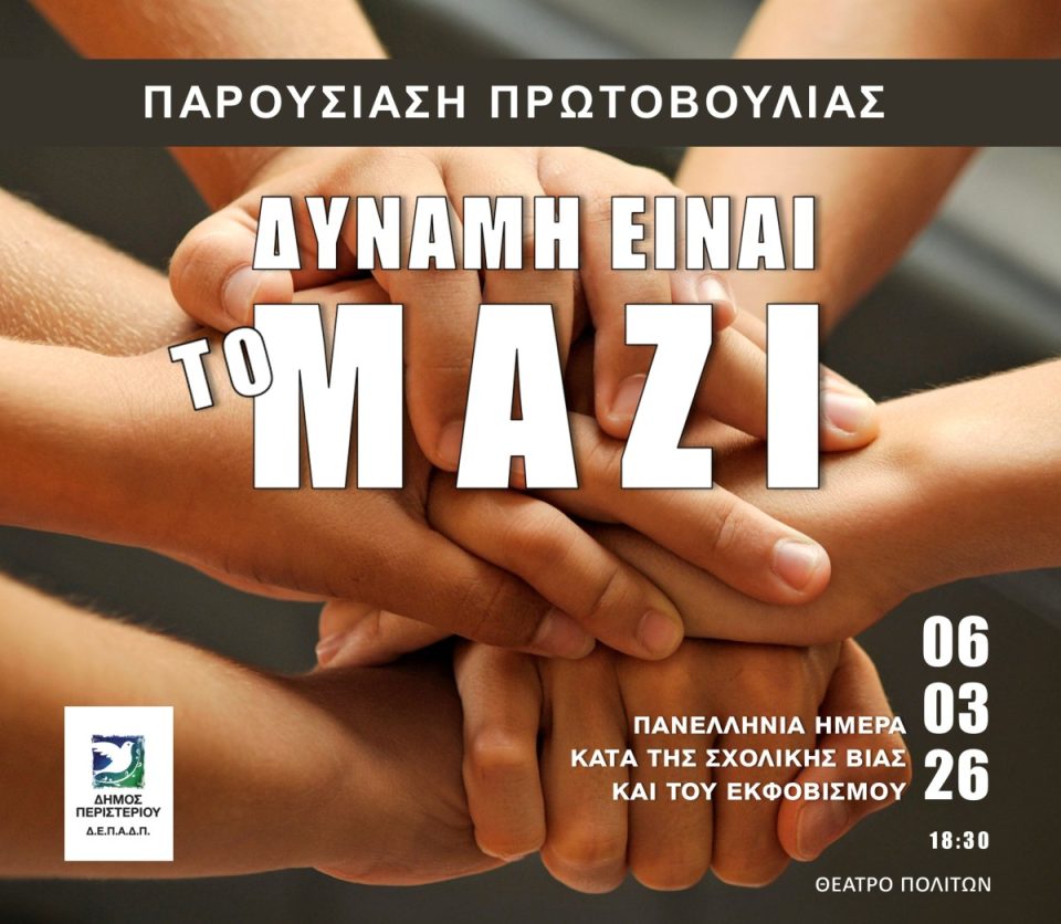 Με στόχο την πρόληψη και την αντιμετώπιση της μαθητικής βίας και του σχολικού εκφοβισμού, ο Δήμαρχος Περιστερίου παρουσιάζει την πρωτοβουλία «Δύναμη είναι το Μαζί», ένα ολοκληρωμένο πλαίσιο δράσεων που απευθύνεται στη σχολική κοινότητα και τις οικογένειες της πόλης.