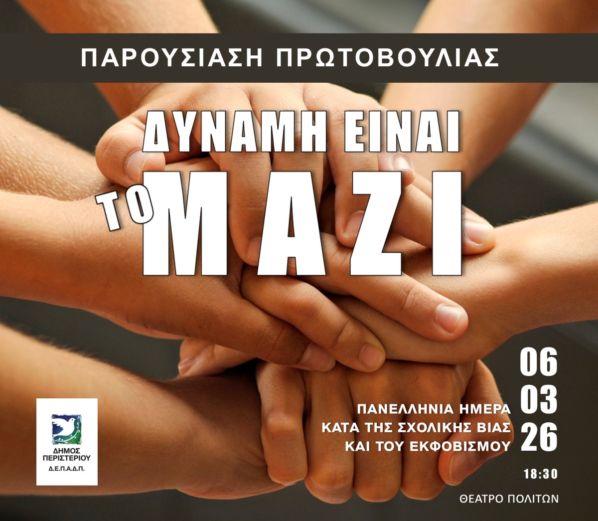Ο Δήμος Περιστερίου καλεί εκπαιδευτικούς, γονείς, μαθητές και όλους τους πολίτες να συμμετάσχουν ενεργά στην παρουσίαση της πρωτοβουλίας, στηρίζοντας έμπρακτα το μήνυμα ότι η δύναμη βρίσκεται στη συνεργασία και στη συλλογική δράση.