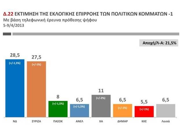 Σε σύγκριση με το βαρόμετρο του Μαρτίου η ΝΔ έχει αμετάβλητο ποσοστό, ενώ ο ΣΥΡΙΖΑ πέφτει 2%.