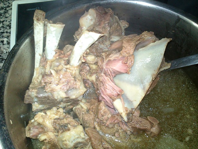 Zεσταίνουμε σε μια κατσαρόλα νερό και νεροβράζουμε την προβατίνα, ξαφρίζοντας σταδιακά, για μία ώρα περίπου.