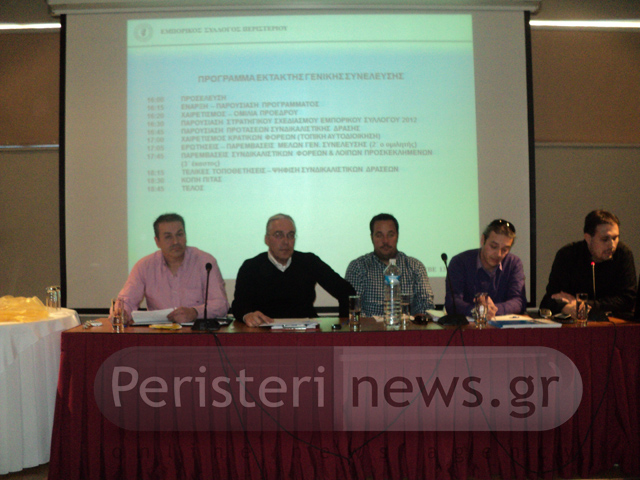 Ξεπέρασε κάθε προηγούμενο η συμμετοχή των επιχειρηματιών – καταστηματαρχών της πόλης μας, στη Γενική Συνέλευση του Εμπορικού Συλλόγου Περιστερίου, που πραγματοποιήθηκε στις 13 Φεβρουαρίου 2012 το απόγευμα στην αίθουσα του ΚΥΒΕ.