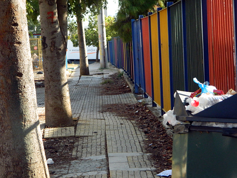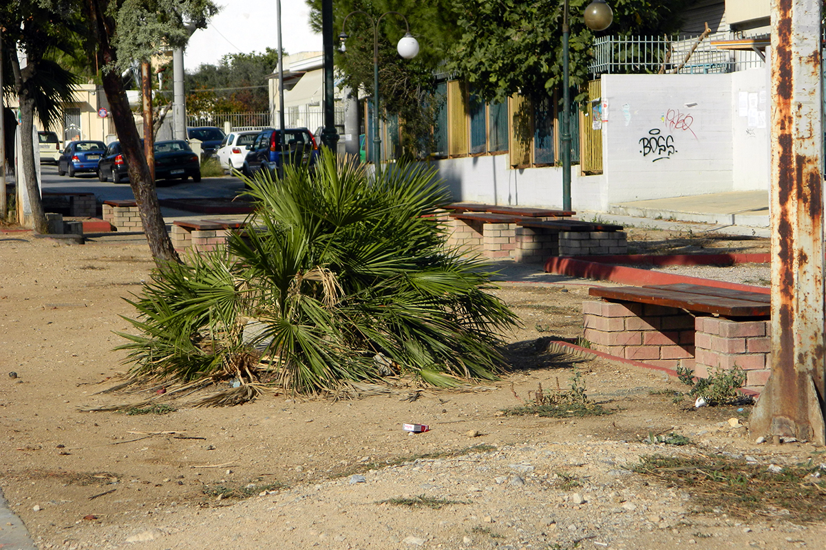 Δέντρα και κάθε είδους φυτά ξεριζωμένα και ανύπαρκτα. Το χώμα έχει γίνει τσιμέντο και οι σωλήνες του ποτίσματος κατεστραμμένες, δείχνουν πως κάποτε, γίνονταν προσπάθειες αυτές οι νησίδες να συμβάλλουν θετικά στη ποιότητα ζωής των κατοίκων της γύρω περιοχής.