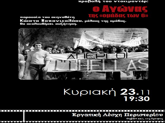 Στα πλαίσια του αφιερώματος «Νοέμβρης ο μήνας των Ανατροπών», Θα προβληθεί την Κυριακή 23 Νοεμβρίου στις 7.30 μμ, το ντοκιμαντέρ ο Αγώνας της «ομάδας των 6», παρουσία του σκηνοθέτη Κώστα Παπανικολάου, μέλους της ομάδας, με τον οποίο θα ακολουθήσει συζήτηση.