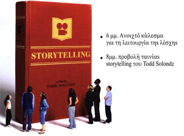 Με την αμερικανική κοινωνία και τη συμπεριφορά της καταπιάνεται και ο Τοντ Σόλοντζ στην ταινία του «Storytelling». Πρόκειται για δυο διαφορετικές ιστορίες (αρχικά επρόκειτο να γυριστούν τρεις) που μας παρουσιάζουν τα διάφορα «κακώς έχοντα» στην ευημερούσα κοινωνία της υπερατλαντικής δύναμης.