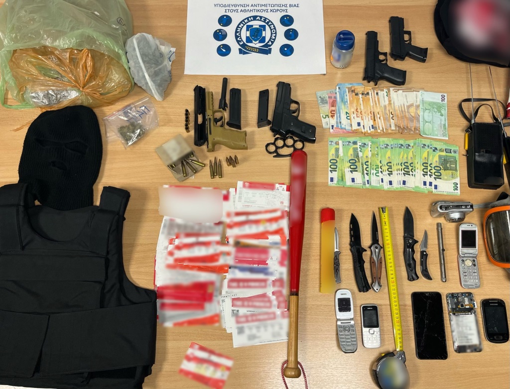 Για τον τερματισμό της δράσης τους οργανώθηκε και υλοποιήθηκε, τη Δευτέρα 22 Απριλίου 2024, αστυνομική επιχείρηση με την κωδική ονομασία «ΔΑΜΟΚΛΕΙΟΣ ΣΠΑΘΗ», στο πλαίσιο της οποίας συνελήφθησαν 63 μέλη της οργάνωσης, που συνολικά απαρτίζεται από 160 άτομα, τα οποία κατηγορούνται για κατά περίπτωση εγκληματική οργάνωση, ανθρωποκτονία από πρόθεση, επικίνδυνες σωματικές βλάβες, διατάραξη κοινής ειρήνης, έκρηξη, ληστεία, εκβίαση, εμπρησμό, κλοπή, φθορά ξένης ιδιοκτησίας και για παραβάσεις σχετικές με τις εκρηκτικές ύλες, τις φωτοβολίδες, τα βεγγαλικά, τα όπλα σε συνδυασμό με τη νομοθεσία περί αθλητισμού.