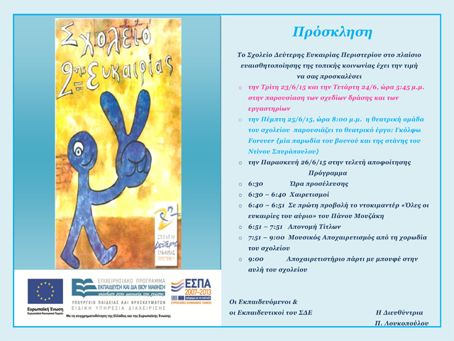 Το Σχολείο Δεύτερης Ευκαιρίας Περιστερίου ολοκληρώνει το 15ο έτος λειτουργίας του και σας προσκαλεί την Τρίτη 23 και Τετάρτη 24 Ιουνίου 2015 στο αμφιθέατρο του σχολείου.