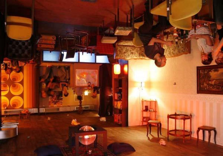 Καρέκλες, τραπέζια, διακοσμητικά αντικείμενα, φωτιστικά και ό,τι μπορεί να φανταστεί κανείς κρέμονται ανάποδα από την οροφή του μπαρ, δημιουργώντας την αίσθηση στους επισκέπτες ότι ο κόσμος… αναποδογύρισε!