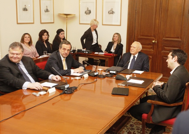 Σε εξέλιξη η κρίσιμη σύσκεψη των πολιτικών αρχηγών. Σαμαράς, Βενιζέλος, Τσίπρας, Καμμένος και Κουβέλης θα αποφασίσουν να θα οδηγηθούμε και πάλι στις κάλπες ή θα οδηγηθούμε σε μία κυβέρνηση προσωπικοτήτων, όπως πρότεινε και ο πρόεδρος Παπούλιας.