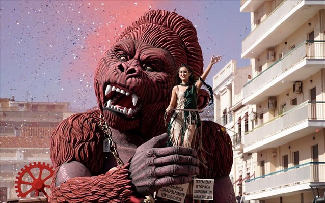 Το μεγαλοπρεπές και εντυπωσιακό άρμα του φετινού βασιλιά καρνάβαλου σατιρίζει την αστική δημοκρατία, ενώ το άρμα της βασίλισσας, Αναστασίας Ψαρρού, είναι η ανάπτυξη με τη μορφή ενός εξωπραγματικού τέρατος, του γορίλα Κινγκ Κονγκ.