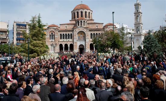 Την εξόδιο ακολουθία έψαλε ο σεβασμιότατος Μητροπολίτης Δημητριάδος κ. Ιγνάτιος, ενώ μέσα και έξω από το ναό, εκατοντάδες πολιτών παρακολουθούσαν σιωπηλά.