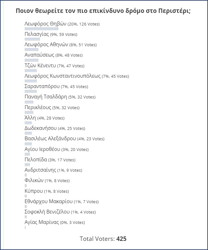 Με διαφορά πιο επικίνδυνος δρόμος στο Περιστέρι αναδείχθηκε η λεωφόρος Θηβών με 126 ψήφους ενώ την πρώτη πεντάδα συμπλήρωσαν οι Πελασγίας(59), Λεωφόρος Αθηνών(51), Αναπάυσεως(48) και Τζών Κένεντυ(47).